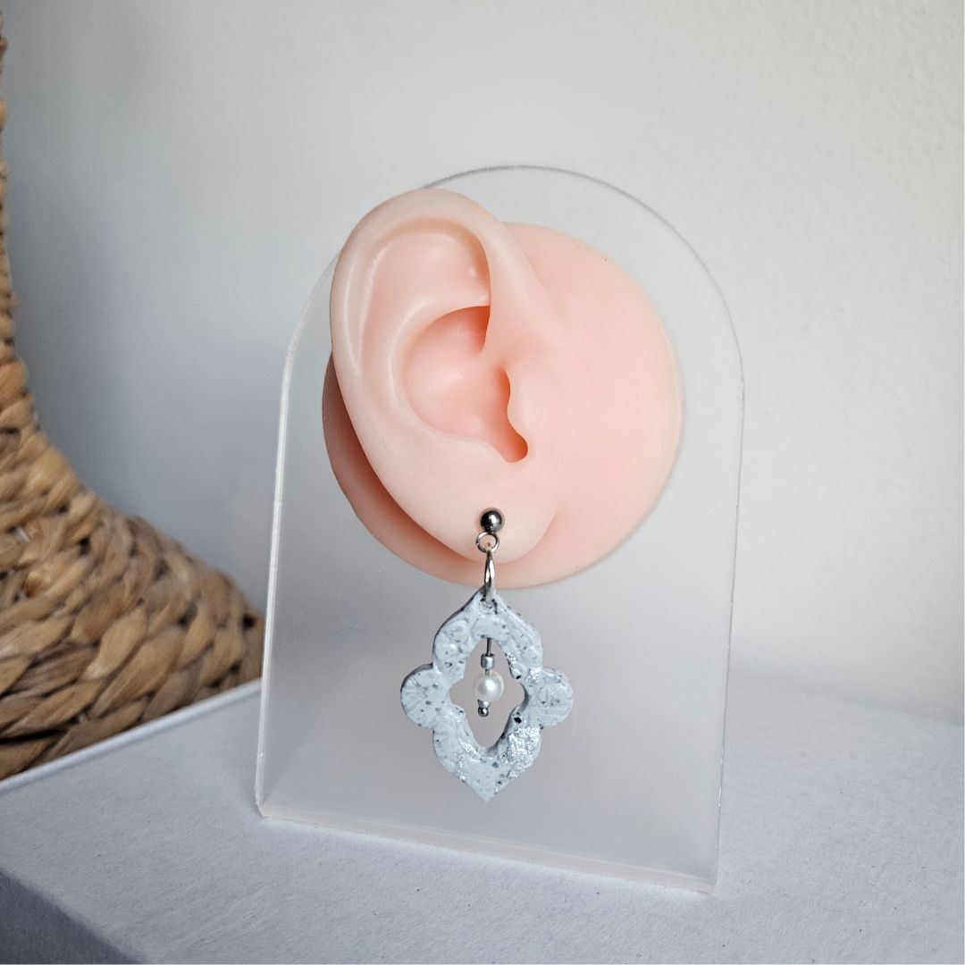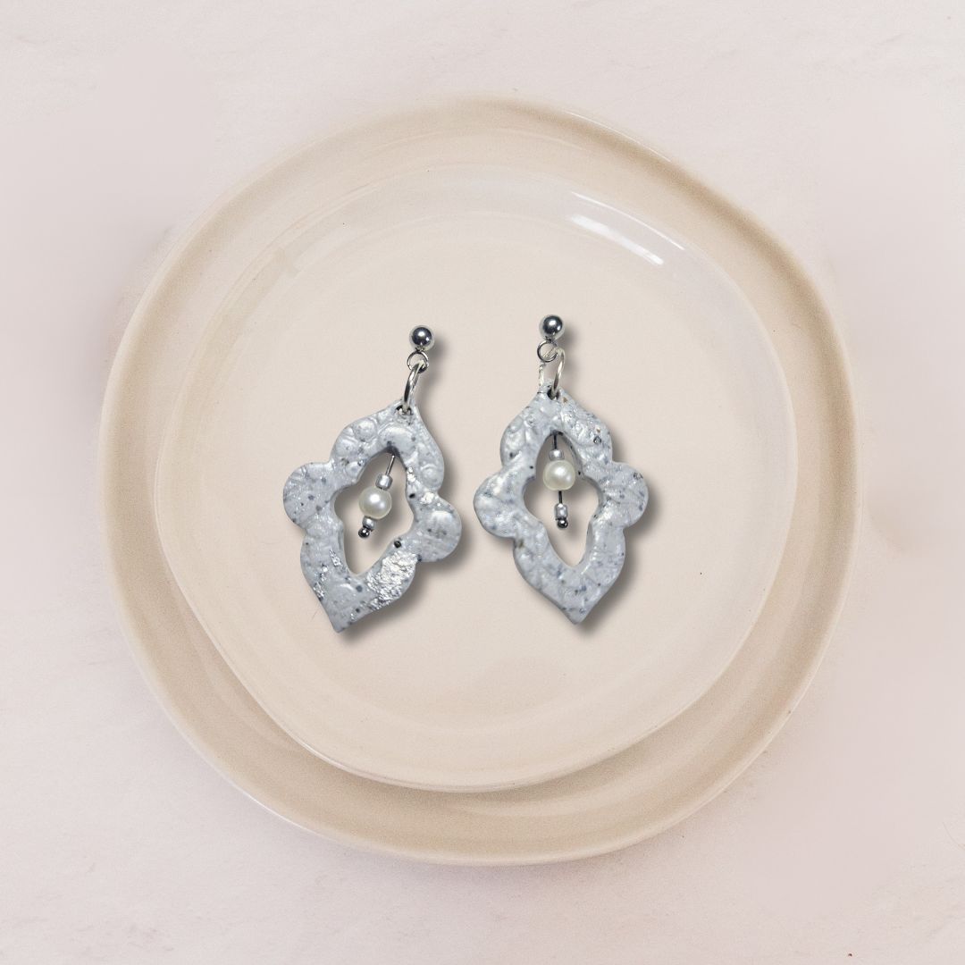 Die Kombination des silbergrauen Musters mit den Perlen verleiht diesen Ohrringen das gewisse Etwas.